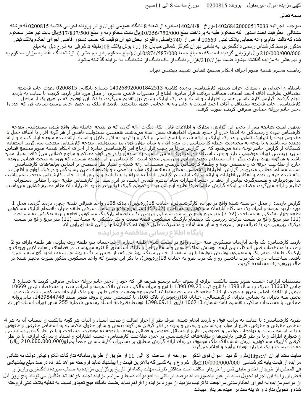 بموجب  اجرائیه 140268420000517033مورخ   1402/4/8صادره از شعبه 8 دادگاه عمومی تهران و در پرونده اجرایی کلاسه 0200815 له فرشته مشتاقی   بطرفیت احمد اسدی   که محکوم علیه به پرداخت مبلغ 10/356/750/000ریال بابت محکوم به و مبلغ 517/837/500ریال بابت نیم عشر محکوم شده که ثالث  بنام پروانه حجابی پلاک ثبتی  10669 فرعی از 3740اصلی واقع در بخش تهران توقیف که حسب دستور قاضی اجرای احکام پلاک ثبتی مذکور توسط کارشناس رسمی دادگستری  به نشانی تهران کارگر شمالی خیابان 18 زره پوش پلاک 108طبقه 4 شرقی  به شرح ذیل  به مبلغ 210/000/000/000 ریال ارزیابی گردیده است.که به مبلغ جمعا 10/874/587/000ریال(مبلغ محکوم به و نیم عشر )  ازششدانگ  فقط به میزان محکوم به و نیم عشر به مزایده گذاشته میشود ضمنا میزان310/هزارم دانگ از یک دانگ از ششدانگ  به مزایده گذاشته میشود