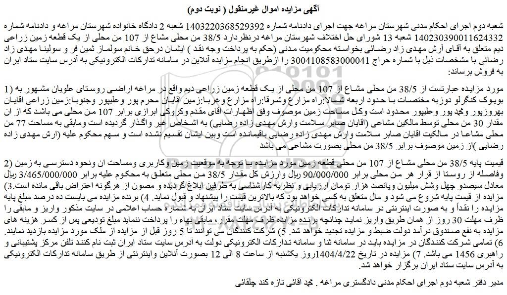 شعبه دوم اجرای احکام مدنی شهرستان مراغه جهت اجرای دادنامه شماره 1403220368529392 شعبه 2 دادگاه خانواده شهرستان مراغه و دادنامه شماره 140230390011624332 شعبه 13 شورای حل اختلاف شهرستان مراغه درنظردارد 38/5 من محلی مشاع از 107 من محلی از یک قطعه زمین زراعی دیم متعلق به آقای آرش مهدی زاد رضائی بخواسته محکومیت مدنی (حکم به پرداخت وجه نقد ) ایشان درحق خانم سولماز ثمین فر و سولینا مهدی زاد رضائی با مشخصات ذیل با شماره حراج 3004108583000041 را ازطریق انجام مزایده آنلاین در سامانه تدارکات الکترونیکی به آدرس سایت ستاد ایران به فروش برساند: