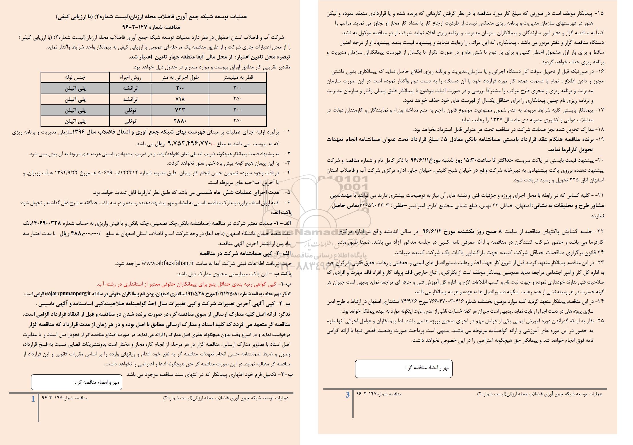 شرکت آب و فاضلاب استان اصفهان در نظر دارد عملیات توسعه شبکه جمع آوری فاضلاب محله ارزنان (لیست شماره 2) با ارزیابی کیفی را از محل اعتبارات جاری شرکت و از طریق مناقصه یک مرحله ای عمومی با ارزیابی کیفی به پیمانار واجد شرایط واگذار نماید