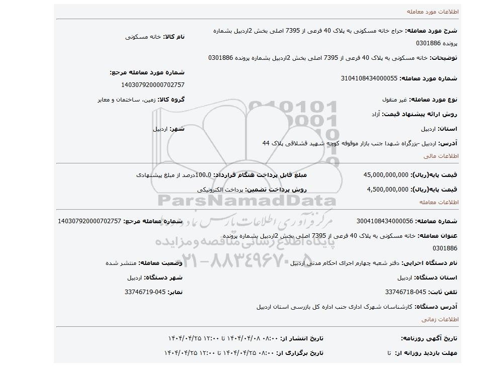 عنوان معامله: خانه مسکونی به پلاک 40 فرعی از 7395 اصلی بخش 2اردبیل بشماره پرونده 0301886