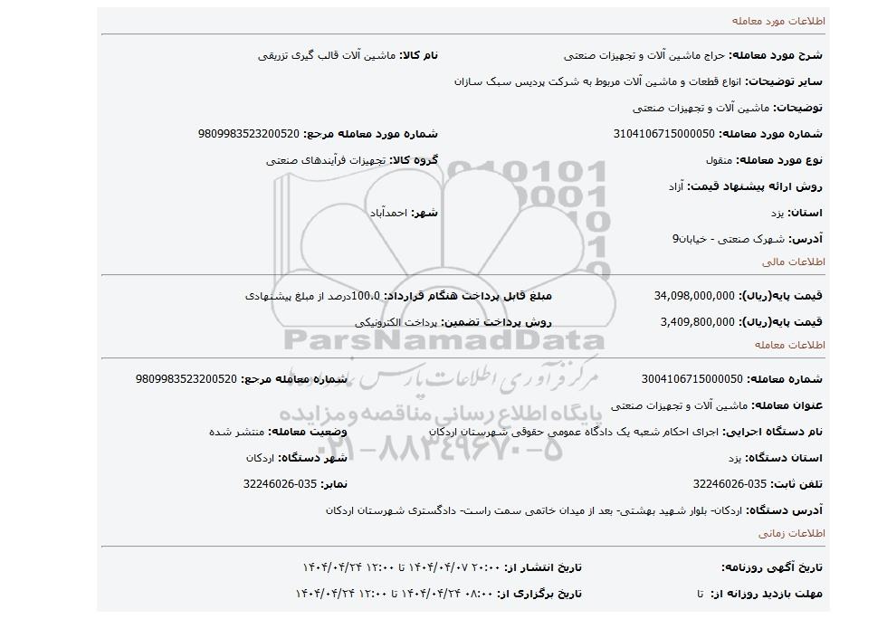 | شماره مورد معامله: 3104106715000050 | شماره مورد معامله مرجع: 9809983523200520 | |