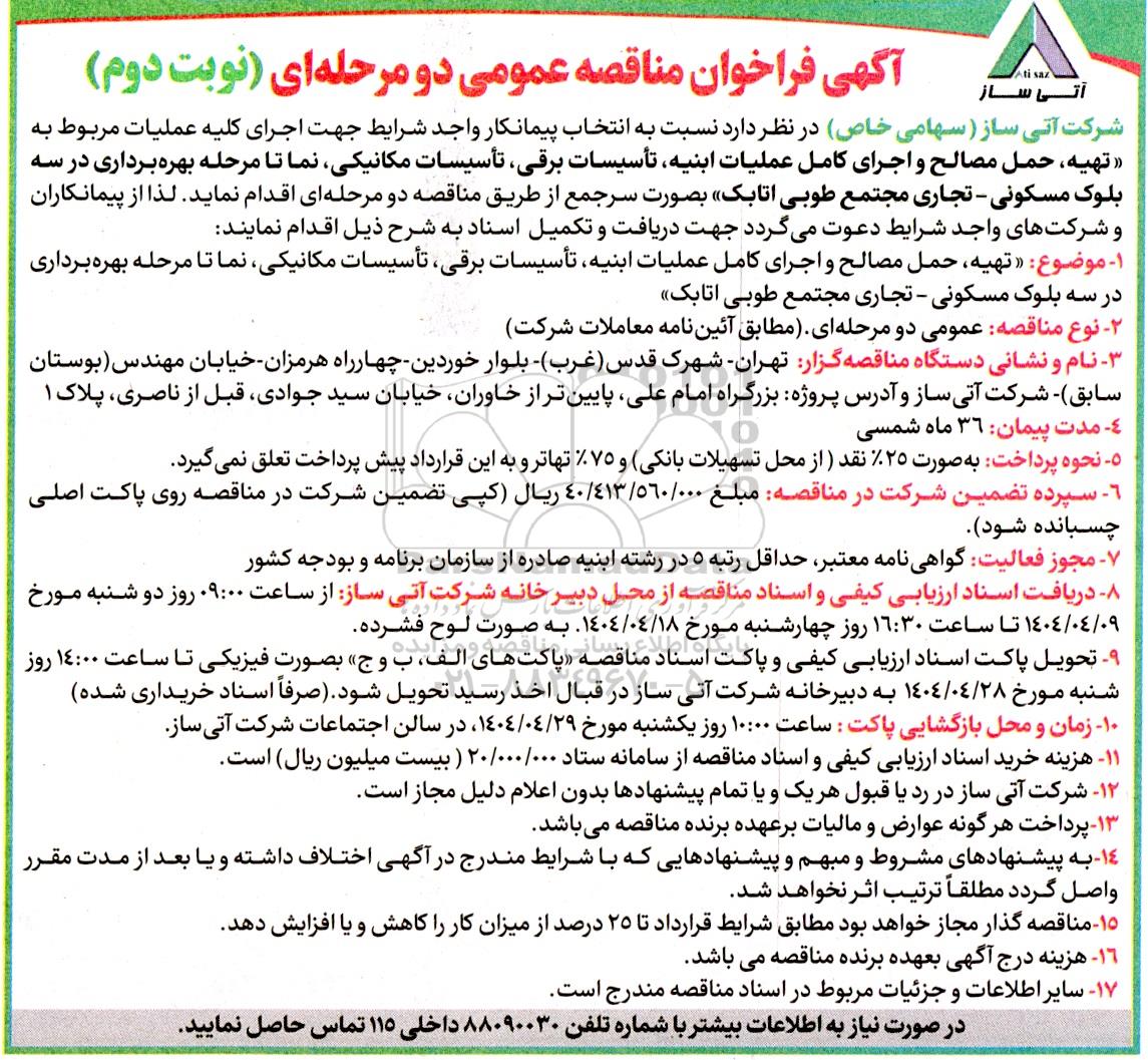 شرکت آتی ساز (سهامی خاص) در نظر دارد نسبت به انتخاب پیمانکار واجد شرایط جهت اجرای کلیه عملیات مربوط به تهیه حمل مصالح و اجرای کامل عملیات ابنیه تأسیسات برقی تأسیسات مکانیکی نما تا مرحله بهره برداری در سه بلوک مسکونی - تجاری مجتمع طوبی اتابک بصورت سرجمع از طریق مناقصه دو مرحله ای اقدام نماید. لذا از پیمانکاران و شرکتهای واجد شرایط دعوت میگردد جهت دریافت و تکمیل اسناد به شرح ذیل اقدام نمایند