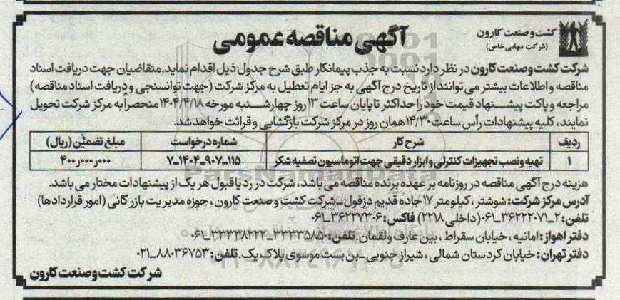 مناقصه تهیه و نصب تجهیزات کنترلی و ابزار دقیقی جهت اتوماسیون تصفیه شکر از کلیه افراد متخصص و شرکتها واجد شرایط دعوت به عمل میآید در مناقصه با کد خبرگزاری پارس نماد: 9204743 شرکت نمایند.