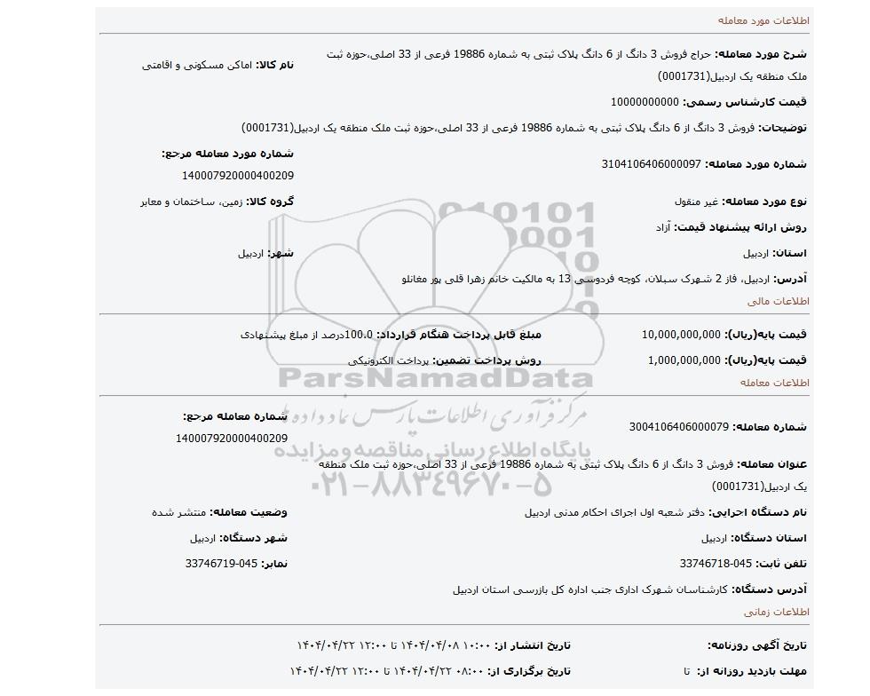 مزایده عمومی مزایده فروش 3 دانگ از 6 دانگ پلاک ثبتی به شماره 19886 فرعی از 33 اصلیحوزه ثبت ملک منطقه یک اردبیل(0001731) برگزار میگردد. از کلیه افراد متخصص و شرکتهای واجد شرایط دعوت به عمل میآید تا در این مزایده با کد خبرگزاری پارس نماد : 9206611 شرکت نمایند تاریخ شروع مزایده : 1404/04/08 مهلت شرکت در مزایده: تا پایان روز 1404/04/22