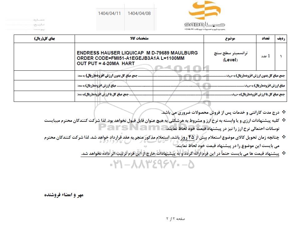 | 1 | 1 عدد | ترانسمیتر سطح سنج (Level) | ENDRESS HAUSER LIQUICAP MD-79689 MAULBURG ORDER CODE=FMI51-A1EGEJB3A1A L=1100MM OUT PUT = 4-20MA HART |
