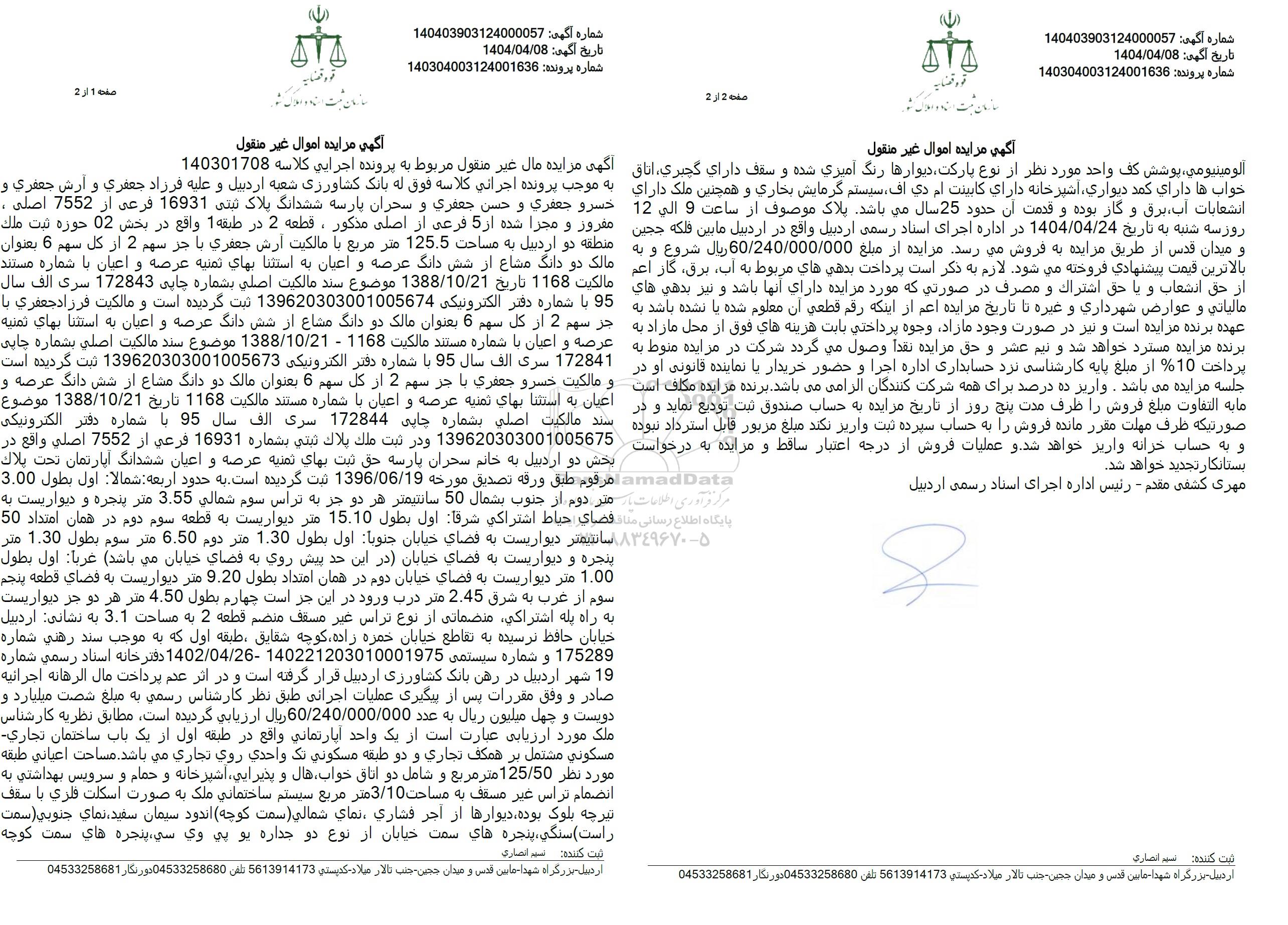 مزایده عمومی مزایده ششدانگ پلاک 16931 فرعی از 7552 اصلی برگزار میگردد. از کلیه افراد متخصص و شرکتهای واجد شرایط دعوت به عمل میآید تا در این مزایده با کد خبرگزاری پارس نماد : 9208462 شرکت نمایند تاریخ شروع مزایده : 1404/04/08 مهلت شرکت در مزایده: تا پایان روز 1404/04/24 مکان برگزاری اموال واگذاری استانهای اردبیل و دستهبندیهای مربوط به این حراجی املاک و زمین میباشد.