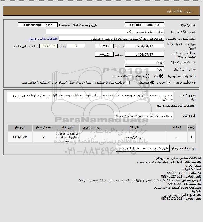 | 1 | -- | درب کرکره ای | عدد | مصالح ساختمانی و ملزومات ساخت و ساز | 2 | 1404/05/31 |