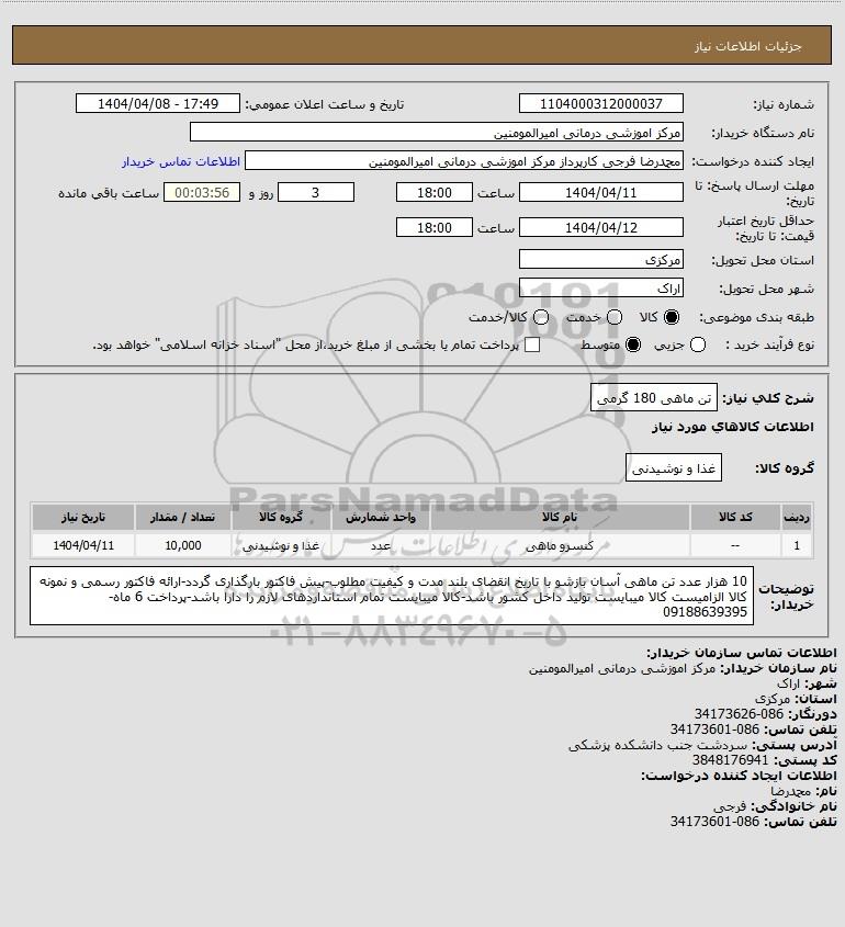 توضیحات خریدار:10 هزار عدد تن ماهی آسان بازشو با تاریخ انقضای بلند مدت و کیفیت مطلوب-پیش فاکتور بارگذاری گردد-ارائه فاکتور رسمی و نمونه کالا الزامیست کالا میبایست تولید داخل کشور باشد-کالا میبایست تمام استانداردهای لازم را دارا باشد-پرداخت 6 ماه-09188639395