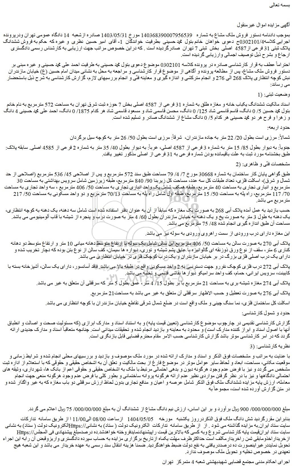 بموجب دادنامه دستور فروش ملک مشاع به شماره 140368390007956539 مورخ 1403/05/31 صادره ازشعبه 14 دادگاه عمومی تهران ودرپرونده اجرایی کلاسه0302101/4ج دعوی خواهان خانم بتول محمد حسینی بطرفیت خواندگان 1- آقای امیر حسین نظری و غیره که حکم به فروش ششدانگ پلاک ثبتی 31 فرعی از4587 اصلی بخش ثبتی 7 تهران صادرگردیده است . که دراین خصوص مراتب جهت ارزیابی به کارشناس رسمی دادگستری ارجاع و بشرح ذیل توصیف اجمالی وارزیابی گردیده است.