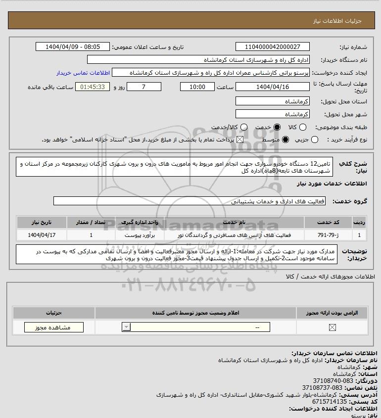شرح کلی نیاز: تامین12 دستگاه خودرو سواری جهت انجام امور مربوط به ماموریت های درون و برون شهری کارکنان زیرمجموعه در مرکز استان و شهرستان های تابعه(8ماه)اداره کل
