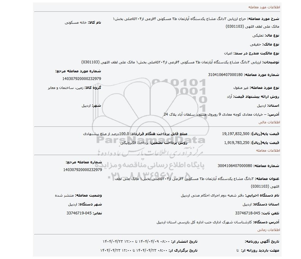 شرح مورد معامله: حراج ارزیابی ۳دانگ مشاع یکدستگاه آپارتمان ط۳ مسکونی ۴فرعی از۵۲۰۴اصلی بخش۱ مالک علی لطف اللهی (0301103) | نام کالا: خانه مسکونی | |