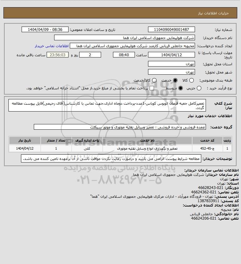 استعلام تعمیرکامل جعبه فرمان اتوبوس کوباس-1عدد-پرداخت دوماه اداریجهت تماس با کارشناس(آقای رحیمی)فایل پیوست مطالعه گردد., استعلام تعمیرکامل جعبه فرمان اتوبوس کوباس-1عدد-پرداخت دوماه اداری،جهت تماس با کارشناس(آقای رحیمی)فایل پیوست مطالعه گردد.