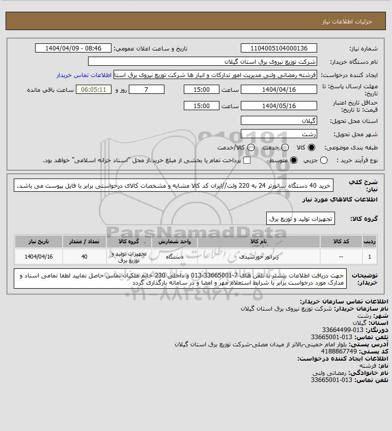 شرح کلی نیاز: خرید 40 دستگاه سانورتر 24 به 220 ولت//ایران کد کالا مشابه و مشخصات کالای درخواستی برابر با فایل پیوست می باشد.