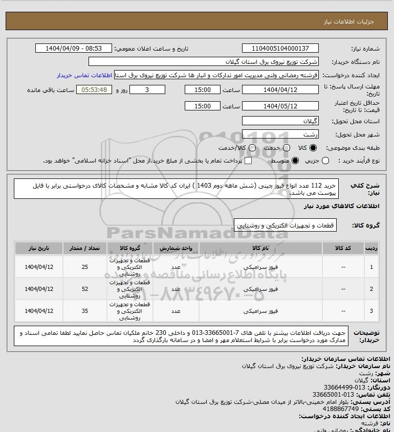 شرح کلی نیاز: خرید 112 عدد انواع فیوز چینی (شش ماهه دوم 1403 ) ایران کد کالا مشابه و مشخصات کالای درخواستی برابر با فایل پیوست می باشد.