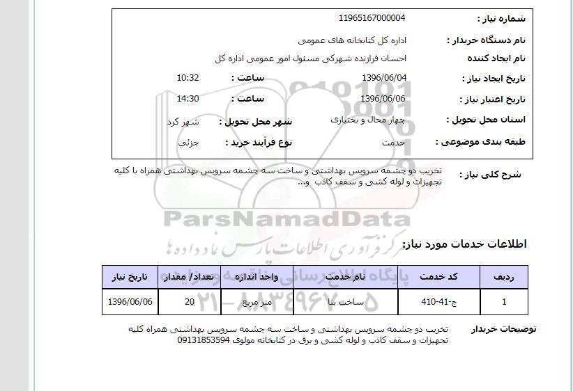 توضیحات خریدار: تخریب دو چشمه سرویس بهداشتی و ساخت سه چشمه سرویس بهداشتی همراه با کلیه تجهیزات و لوله کشی و سقف کاذب و لوله کشی و برق در کتابخانه مولوی 09131853594