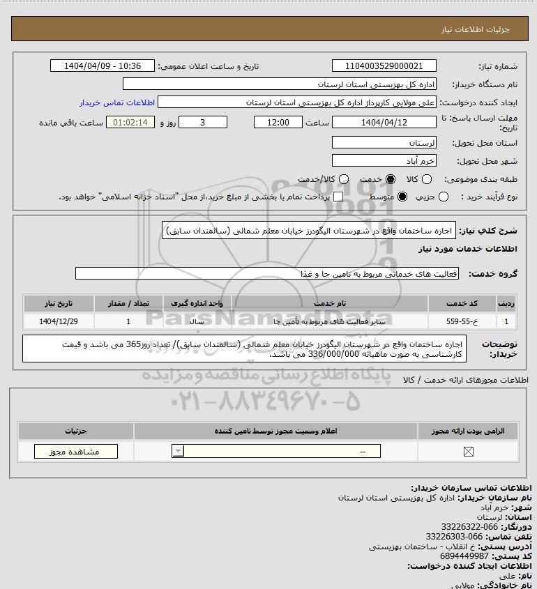 شرح کلی نیاز: اجاره ساختمان واقع در شهرستان الیگودرز خیابان معلم شمالی (سالمندان سابق)