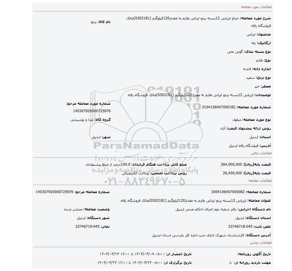 مزایده، ارزیابی 12بسته برنج ایرانی طارم به مقدار120کیلوگرم (0302181)مالک فروشگاه رفاه