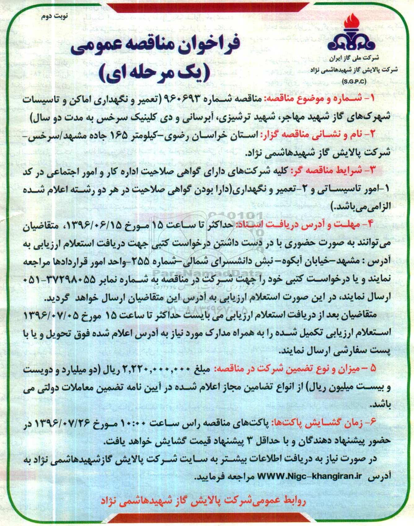 1- موضوع مناقصه : تعمیر و نگهداری اماکن و تاسیسات شهرک های گاز شهید مهاجر و شهید ترشیزی و آبرسانی و دی کلینیک سرخس برای مدت دو سال