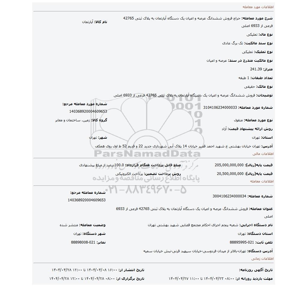 | عنوان معامله: فروش ششدانگ عرصه و اعیان یک دستگاه آپارتمان به پلاک ثبتی 42765 فرعی از 6933 اصلی | ||