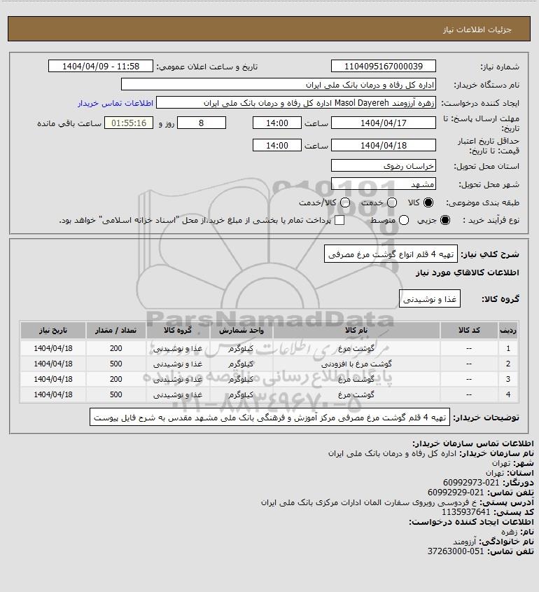 توضیحات خریدار:تهیه 4 قلم گوشت مرغ مصرفی مرکز آموزش و فرهنگی بانک ملی مشهد مقدس به شرح فایل پیوست