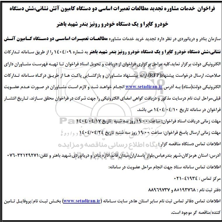 فراخوان خدمات مشاوره تجدید مطالعات تعمیرات اساسی دو دستگاه کامیون آتش نشانی، شش دستگاه خودرو کاپرا و یک دستگاه خودرو رونیز بندر شهید باهنر