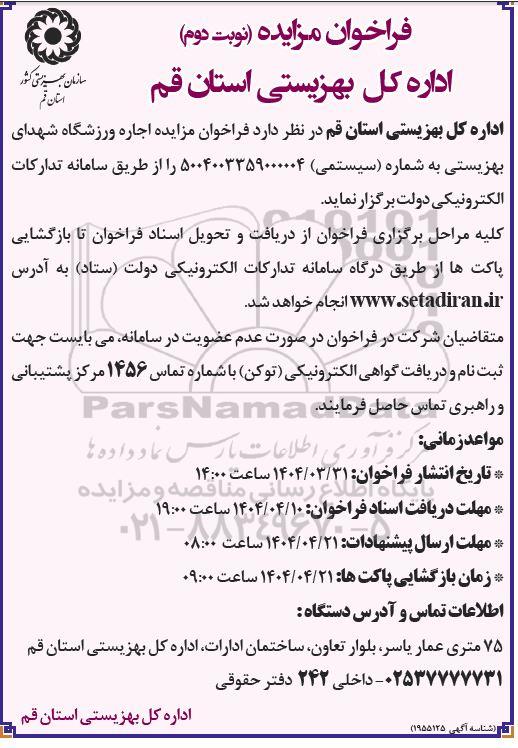 اداره کل بهزیستی استان قم در نظر دارد فراخوان مزایده اجاره ورزشگاه شهدای بهزیستی به شماره (سیستمی) 5004003359000004 را از طریق سامانه تدارکات الکترونیکی دولت برگزار نماید. کلیه مراحل برگزاری فراخوان از دریافت و تحویل اسناد فراخوان تا بازگشایی پاکتها از طریق درگاه سامانه تدارکات الکترونیکی دولت (ستاد) به آدرس ستاد ایران انجام خواهد شد. متقاضیان شرکت در فراخوان در صورت عدم عضویت در سامانه می بایست جهت ثبت نام و دریافت گواهی الکترونیکی (توکن) با شماره تماس 1456 مرکز پشتیبانی و راهبری تماس حاصل فرمایند.