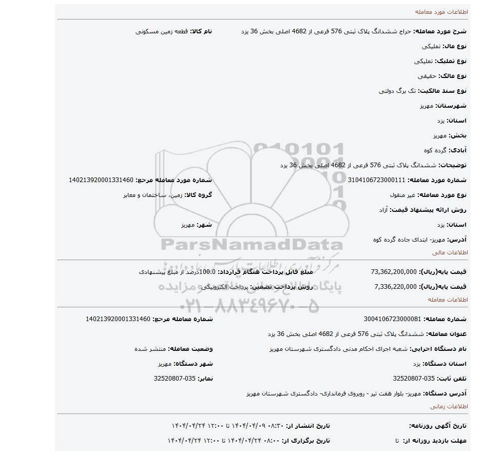 عنوان معامله: ششدانگ پلاک ثبتی 576 فرعی از 4682 اصلی بخش 36 یزد | ||