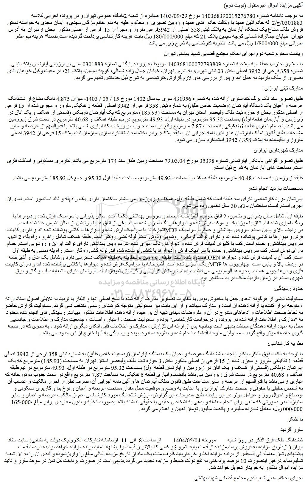 به موجب دادنامه شماره 140368390015276780 مورخ 1403/09/29 صادره از شعبه 2دادگاه عمومی تهران و در پرونده اجرایی کلاسه 0301883/ج/2 له خانم آذین عمید با وکالت خانم هدی عمید و زوبین نصیری و محکوم علیه به نام خانم مژگان مجدی و ایمان مجدی به خواسته دستور فروش ملک مشاع یک دستگاه آپارتمان به پلاک ثبتی 358 اصلی از 3942فرعی مفروز و مجزا از 15 فرعی از اصلی مذکور بخش 3 تهران به آدرس تهران خیابان جمالزاده شمالی کوچه سیمین پلاک 21 که مبلغ 180/000/000 ریال بابت هزینه کارشناسی پرداخت گردیده است.ضمنا" هزینه نیم عشر اجرائی مبلغ 1/800/000 ریال می باشد. نظریه کارشناسی به شرح زیر می باشد:
