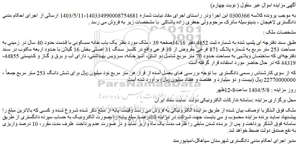 به موجب پرونده کلاسه 0300366 این اجرا ودر راستای اجرای مفاد نیابت شماره 140334990008754681-1403/5/11 ارسالی از اجرای احکام مدنی دادگستری لاهیجان ، بدینوسیله ماترک مرحوم ولی جعفری زاده پاشاکی با مشخصات زیر به فروش می رسد .