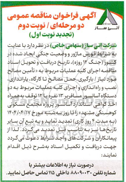شرکت آتی ساز (سهامی خاص) در نظر دارد با عنایت به شرایط فورس ماژور و وضعیت جنگی ایجاد شده در کشور جنگ 12 روزه تاریخ دریافت و تحویل اسناد مناقصه اجرای کلیه عملیات مربوط به تأمین مصالح مورد نیاز / بارگیری، حمل مصالح تا کارگاه، باراندازی، نصب و راه اندازی و اجرای کلیه عملیات مربوط به دو دستگاه آسانسور مسافربر 13 نفره با 12 توقف به همراه اخذ گواهی استاندارد آسانسور پروژه مجتمع مسکونی کوهسنگی مشهد را تا روز سه شنبه مورخ 1404.04.17 به مدت 4 روز کاری تمدید نماید و به تبع آن سایر تاریخ ها نیز به تناسب قبل تمدید می گردد. لذا از پیمانکاران و شرکتهای واجد شرایط دعوت میگردد جهت دریافت و تکمیل اسناد به شرح ذیل اقدام نمایند