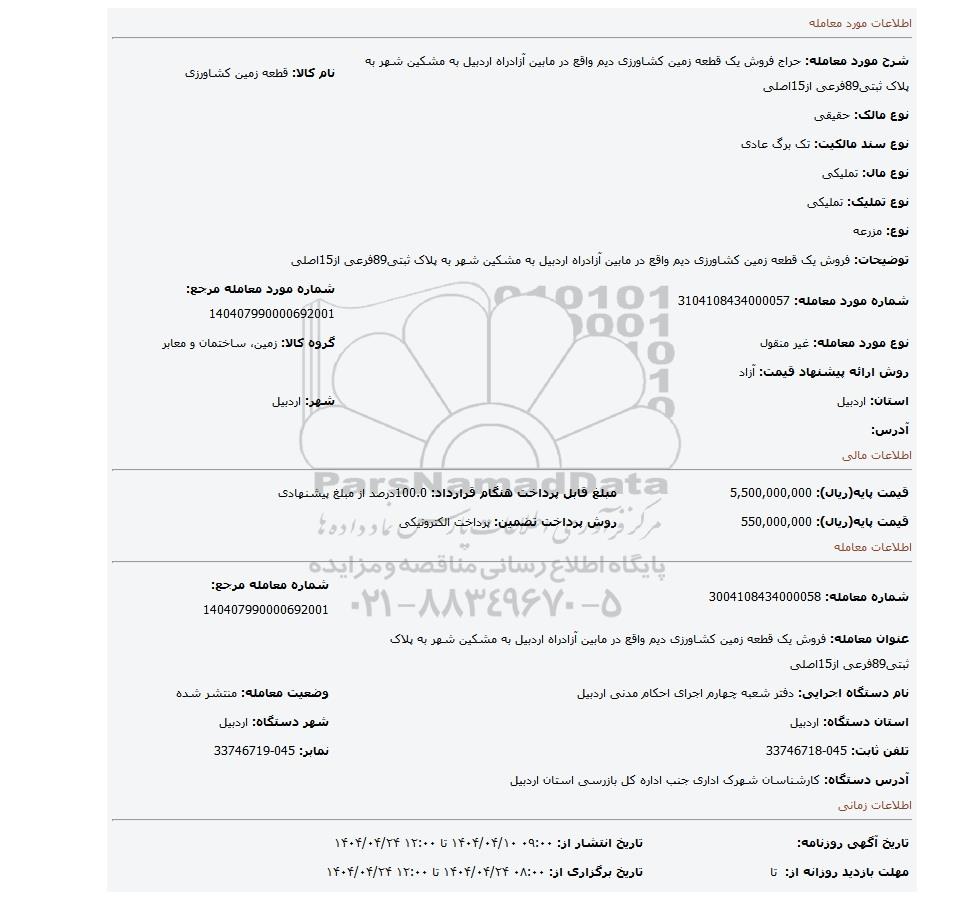 شرح مورد معامله: حراج فروش یک قطعه زمین کشاورزی دیم واقع در مابین آزادراه اردبیل به مشکین شهر به پلاک ثبتی89فرعی از15اصلی نام کالا: قطعه زمین کشاورزی