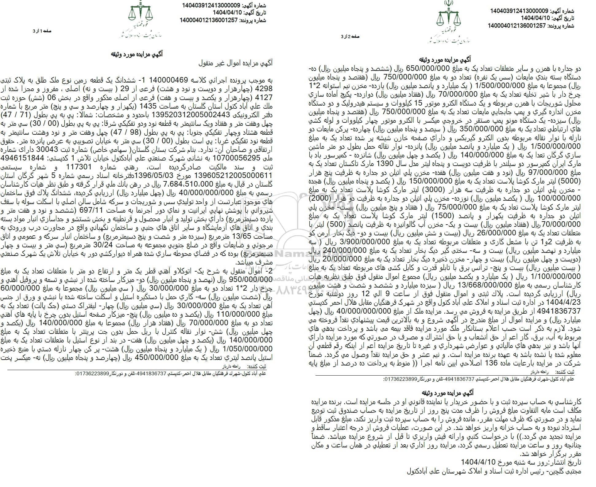 مزایده ششدانگ قطعه زمین پلاک ثبتی 4298 فرعی کلاسه 140000469