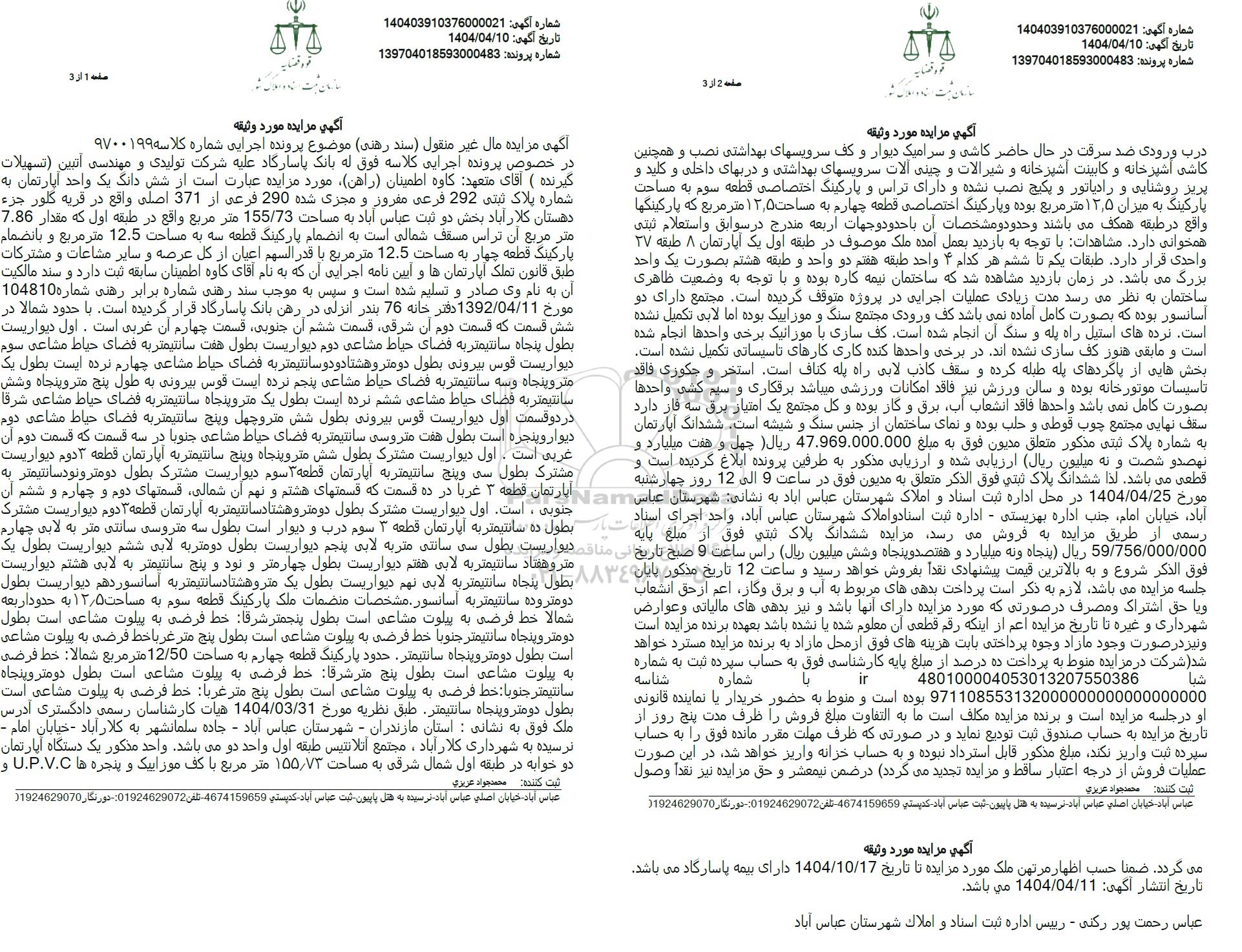 مزایده فروش ششدانگ یک واحد آپارتمان به شماره پلاک ثبتی 292 فرعی مفروز و مجزی شده 290 فرعی از 371 اصلی، بخش دو ثبت عباس آباد به مساحت 155/73 متر مربع