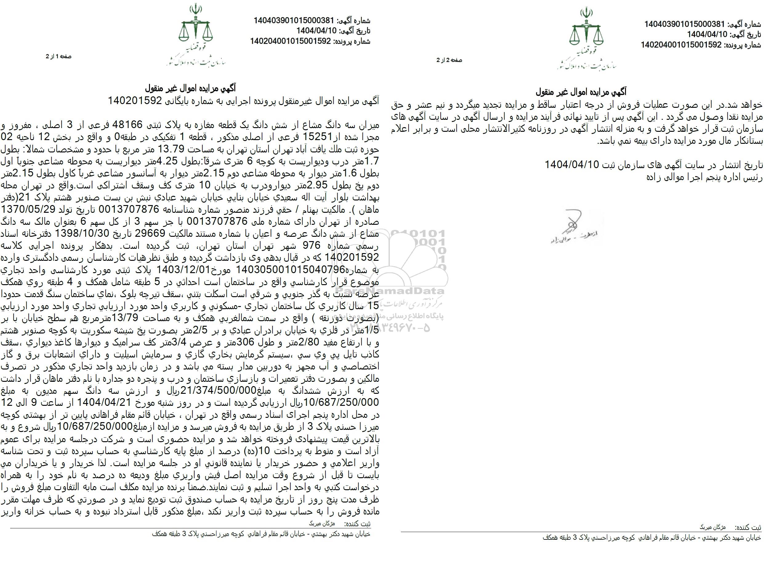 موضوع مزایده : یک قطعه مغازه به پلاک ثبتی 48166 فرعی از 3 اصلی، مفروز و مجزی شده از 15251 فرعی از اصلی مذکور به ارزش 10.687.250.000 ریال