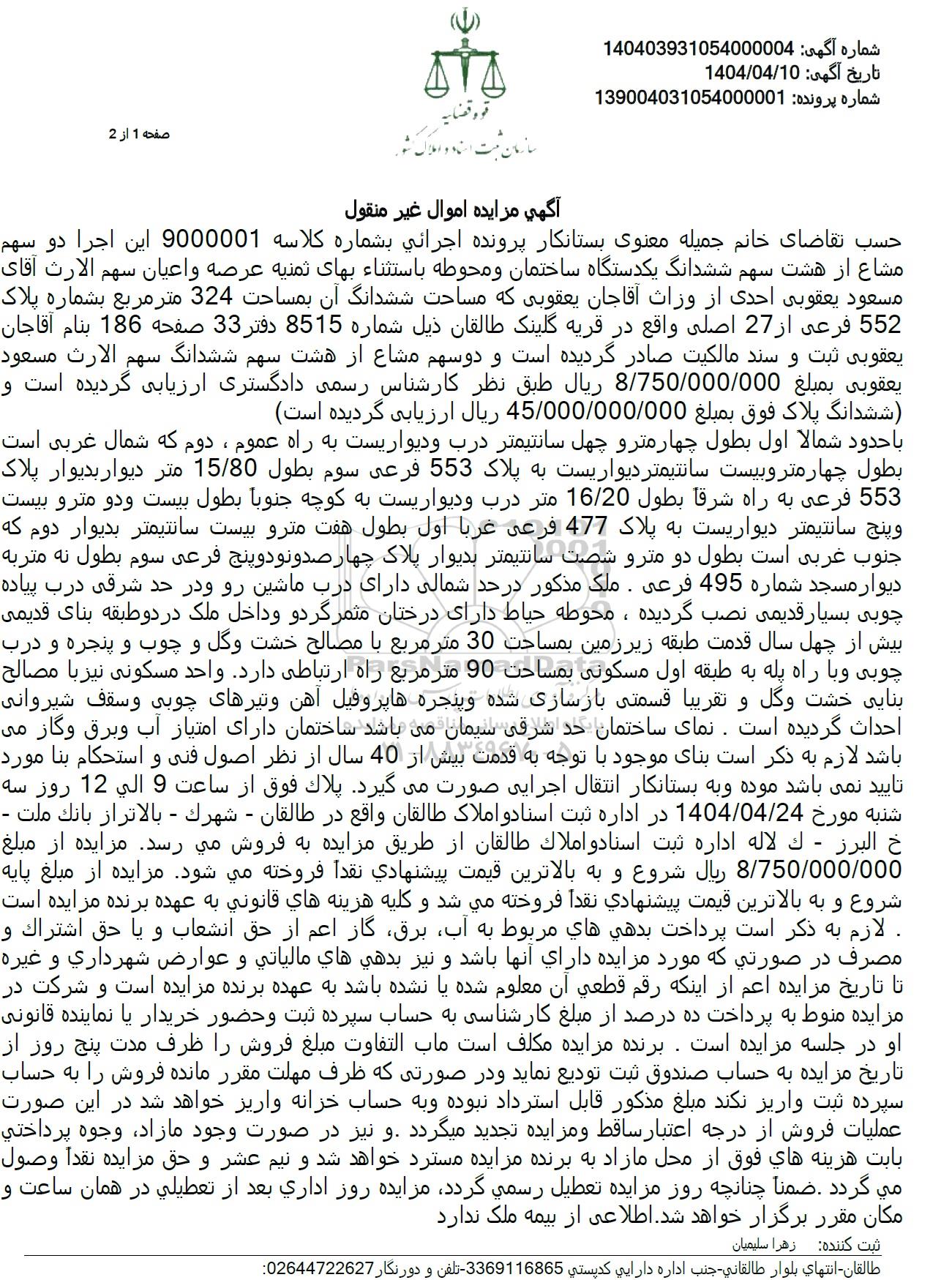 موضوع: مزایده شش دانگ یک دستگاه ساختمان آپارتمان به شماره پلاک 552 فرعی از 27 اصلی به مساحت 324 مترمربع