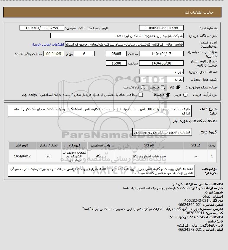 شرح کلی نیاز: باتری سیلداسید 12 ولت 100 آمپر ساعت برند نیل یا صنعت با کارشناس هماهنگ شود/تعداد:96 عدد/پرداخت:چهار ماه اداری