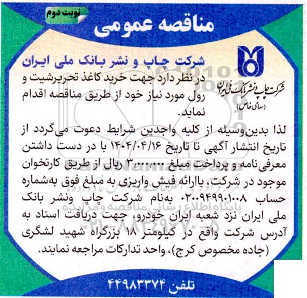 شرکت چاپ و نشر بانک ملی ایران در نظر دارد جهت خرید کاغذ تحریر شیت و رول مورد نیاز خود از طریق مناقصه اقدام نماید.