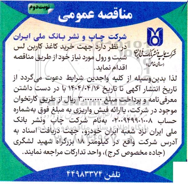 شرکت چاپ و نشر بانک ملی ایران در نظر دارد جهت خرید کاغذ کاربن لس شیت و رول مورد نیاز خود از طریق مناقصه اقدام نماید.