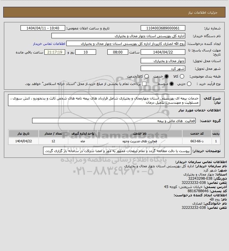 شرح کلی نیاز: خدمات بیمه ای بهزیستی استان چهارمحال و بختیاری شامل قرارداد های بیمه نامه های شخص ثالث و بدنخودرو ، اتش سوزی ، مسئولیت و مهندسی، تکمیل درمان