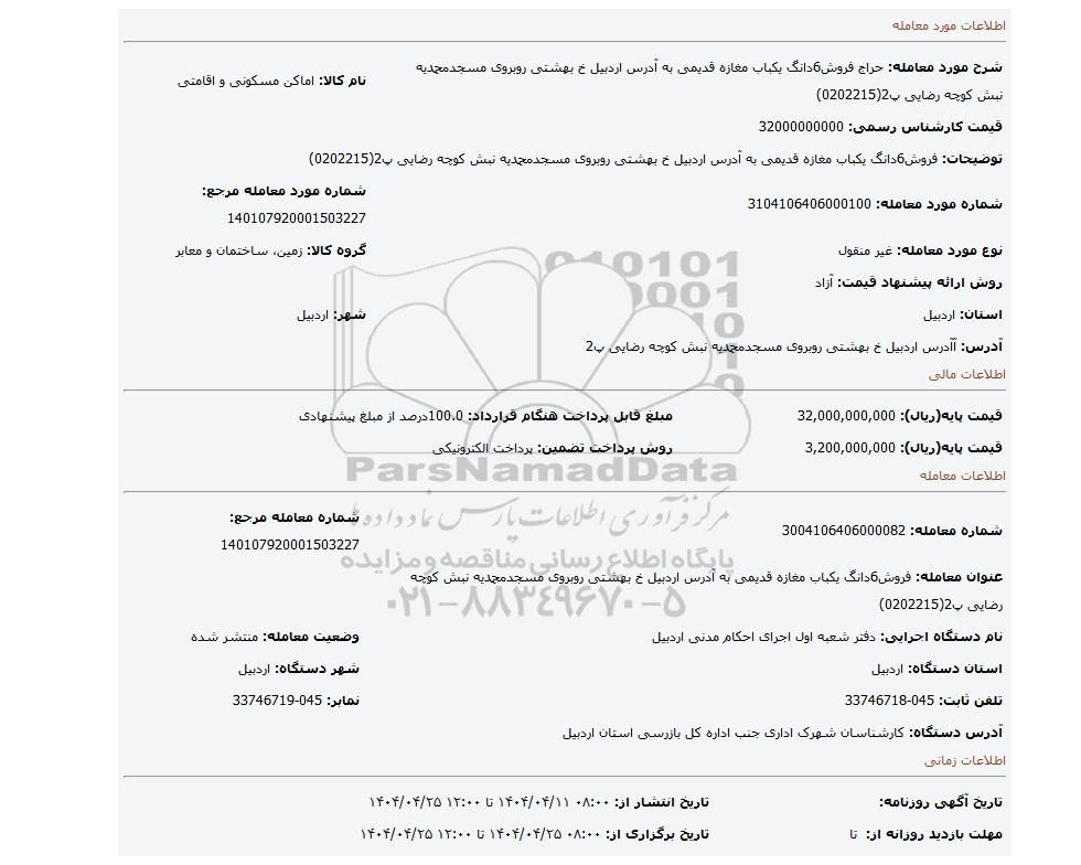 شرح مورد معامله: حراج فروش6دانگ یکباب مغازه قدیمی به آدرس اردبیل خ بهشتی روبروی مسجدمحمدیه نبش کوچه رضایی پ2(0202215) | نام کالا: اماکن مسکونی و اقامتی | |
