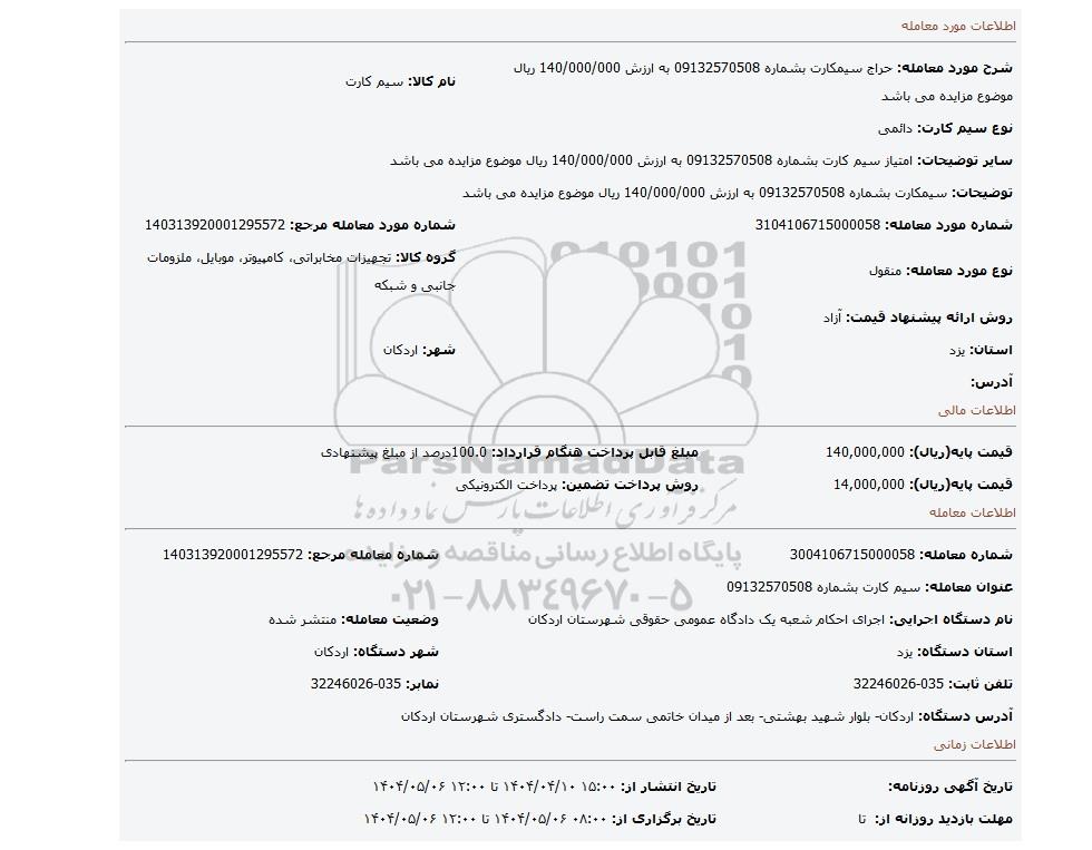 مزایده، سیمکارت بشماره 09132570508 به ارزش 140/000/000 ریال موضوع مزایده می باشد