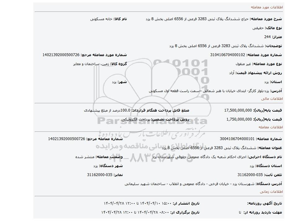 | شرح مورد معامله: حراج ششدانگ پلاک ثبتی 3283 فرعی از 6556 اصلی بخش 8 یزد | نام کالا: خانه مسکونی | |