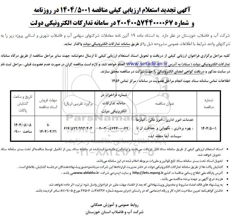 عنوان مناقصه: خدمات امور اداری ، امور مالی ، انبارها بهره برداری ، نگهبانی و حفاظت از تا سیسات آبفا منطقه ايذه