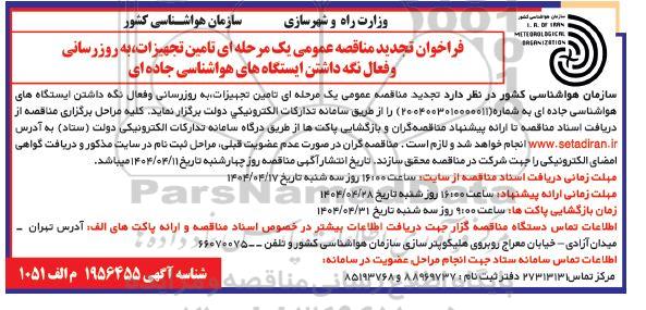 فراخوان تجدید مناقصه عمومی یک مرحله ای تامین تجهیزات ، به روز رسانی و فعال نگه داشتن ایستگاههای هواشناسی جاده ای
