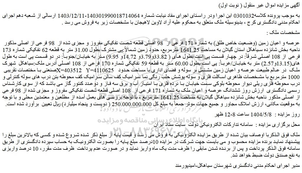 به موجب پرونده کلاسه0301032 این اجرا ودر راستای اجرای مفاد نیابت شماره 140301990018714064-1403/12/11 ارسالی از شعبه دهم اجرای احکام مدنی دادگستری کرج ، بدینوسیله ملک متعلق به محکوم علیه آراد لاوین لاهیجان با مشخصات زیر به فروش می رسد .