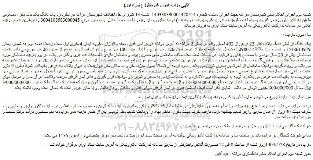 مزایده ملک یک دانگ از شش دانگ پلاک ثبتی 22 فرعی از 492 اصلی, مزایده ملک یک دانگ از شش دانگ پلاک ثبتی 22 فرعی از 492 اصلی