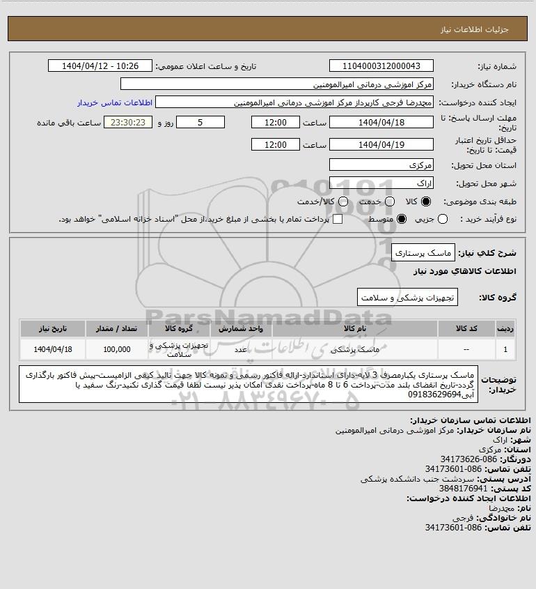 1 -- ماسک پزشکی عدد تجهیزات پزشکی و سلامت 100,000 1404/04/18