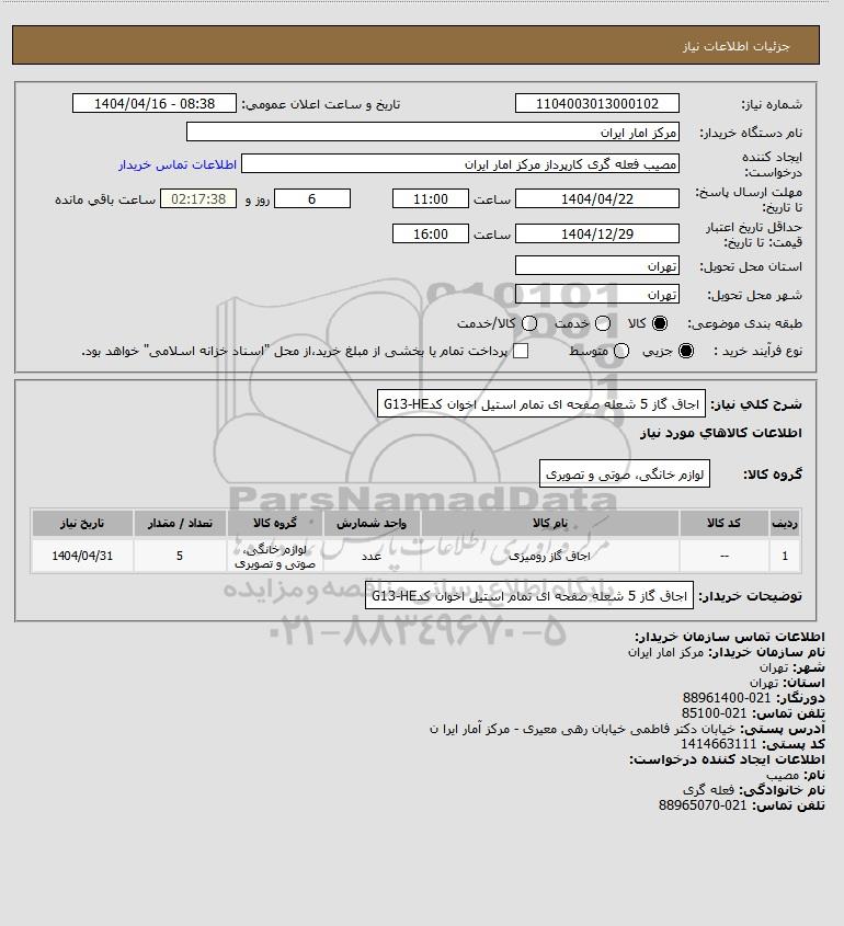 استعلام بها و موضوع استعلام استعلام اجاق گاز 5 شعله صفحه ای تمام استیل اخوان کدG13-HE به اطلاع کلیه شرکت‌ها و افراد متخصص واجد شرایط می‌رساند، آگهی گذار در نظر دارد از طریق استعلام بها، نسبت به انتخاب و دریافت پیشنهادات اقدام نماید. این استعلام با کد آگهی ثبت شده در سامانه خبرگزاری پارس نماد : 9231245 منتشر شده است. مشخصات استعلام : تاریخ شروع استعلام: 1404/04/16 آخرین مهلت ارسال پیشنهاد قیمت : 1404/04/22 و محل اجرای پروژه : استان تهران میباشد. استعلام قیمت مورد درخواست : استعلام اجاق گاز 5 شعله صفحه ای تمام استیل اخوان کدG13-HE با دسته‌بندی‌های تخصصی و گروه های مرتبط : لوازم خانگی, استعلام اطلاع رسانی میگردد.
