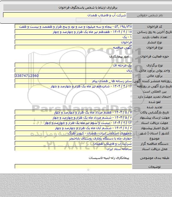 مناقصه حفاری چاه با دستگاه روتاری روستای باباخنجر از کلیه افراد متخصص و شرکتها واجد شرایط دعوت به عمل میآید در مناقصه با کد خبرگزاری پارس نماد: 9232856 شرکت نمایند.
