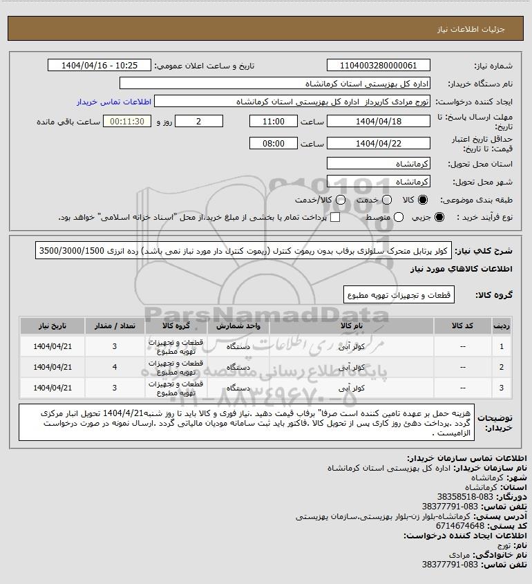 شرح کلی نیاز: کولر پرتابل متحرک سلولزی برفاب بدون ریموت کنترل (ریموت کنترل دار مورد نباز نمی باشد) رده انرزی 3500/3000/1500